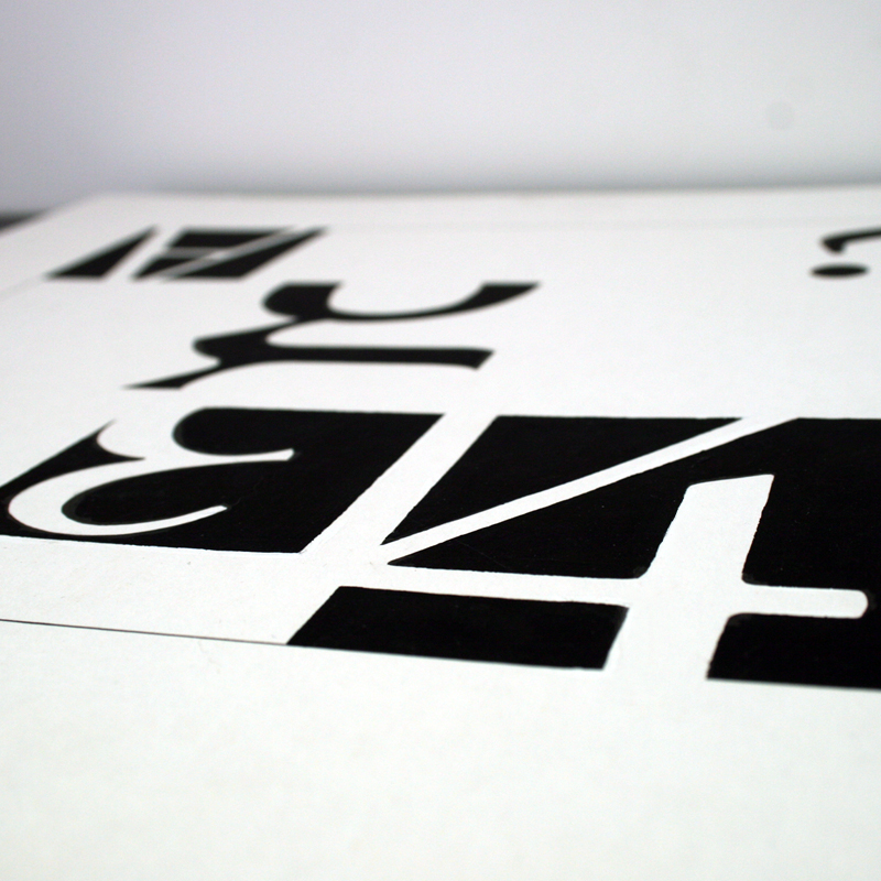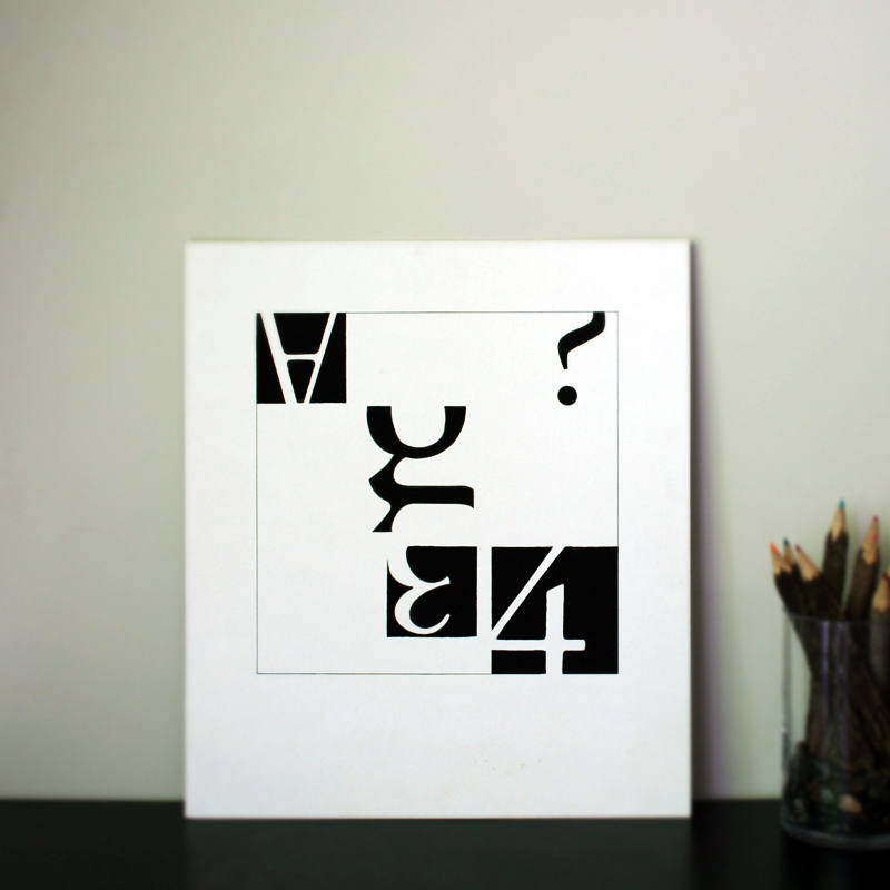 My favorite 5 characters were the: A, g, 3, 4 and ?. I enjoyed working with their edges and curves and how they fit inside the white space. The piece was done on illustration board and hand drawn with ink.