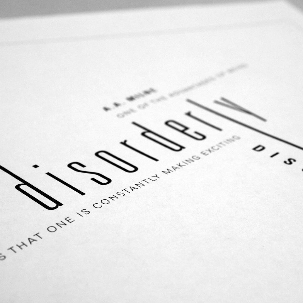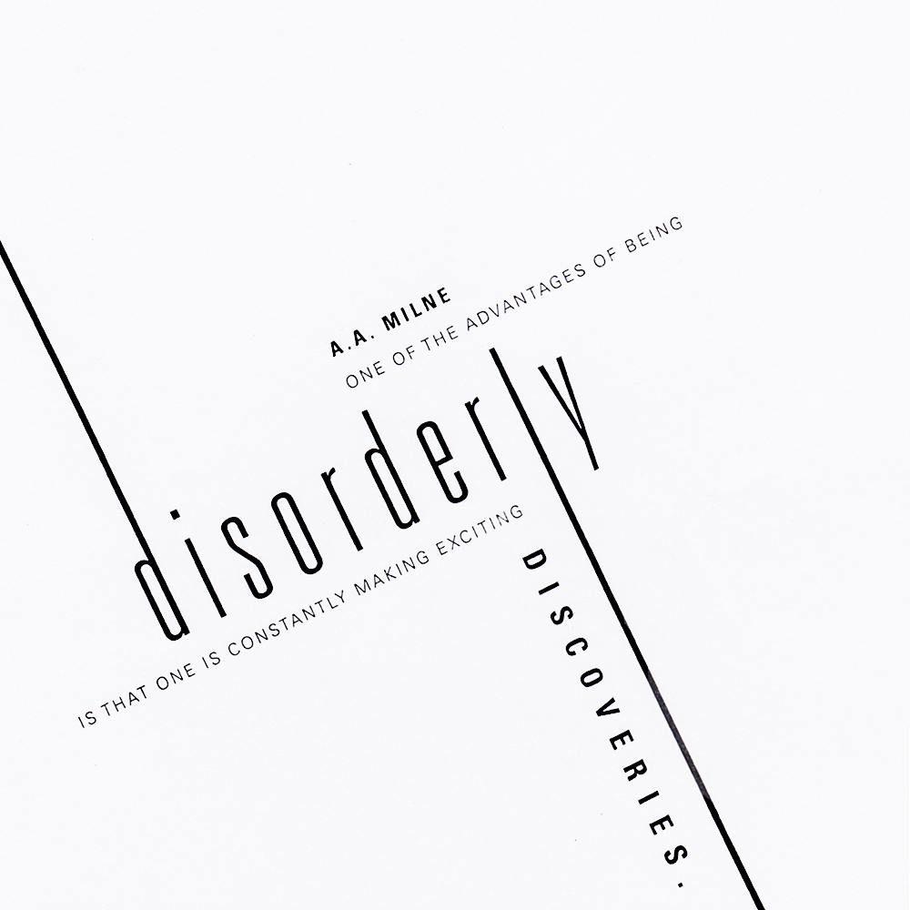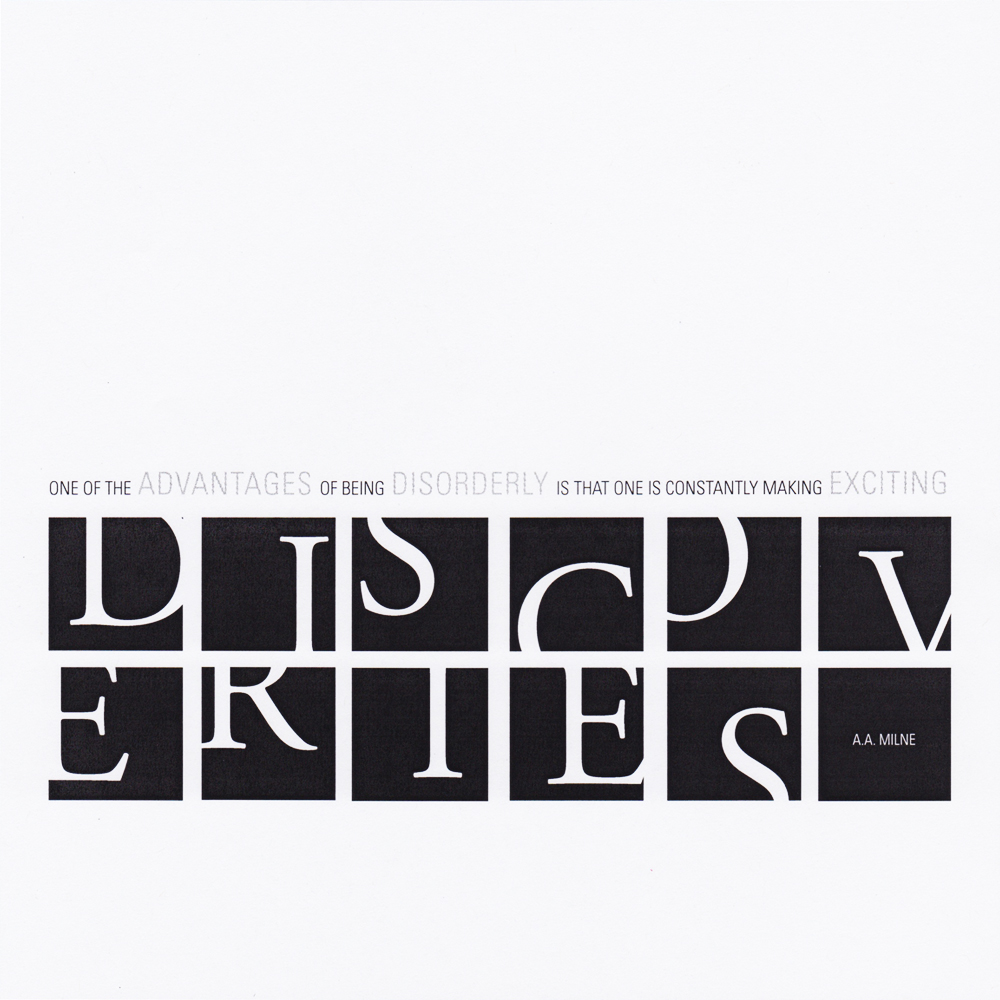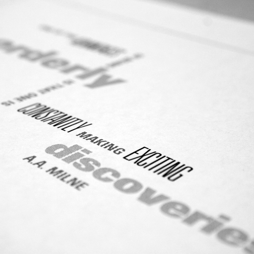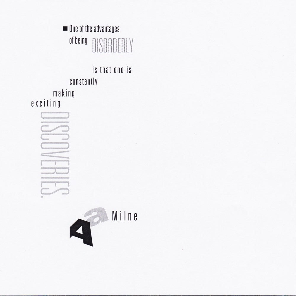 This piece is a quote by A.A Milne which explores micro and macro typographic relationships. The use of white space and variation within the typeface helps to emphasize the meaning of the quote.