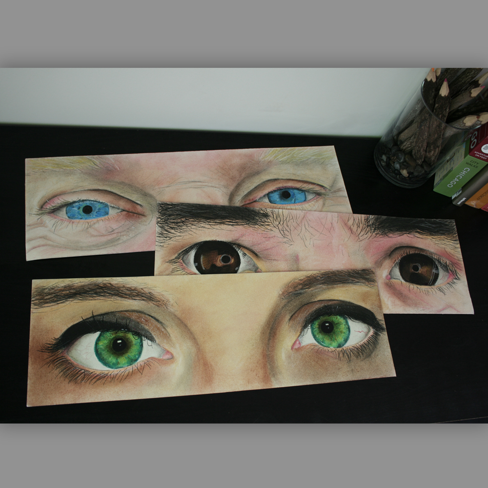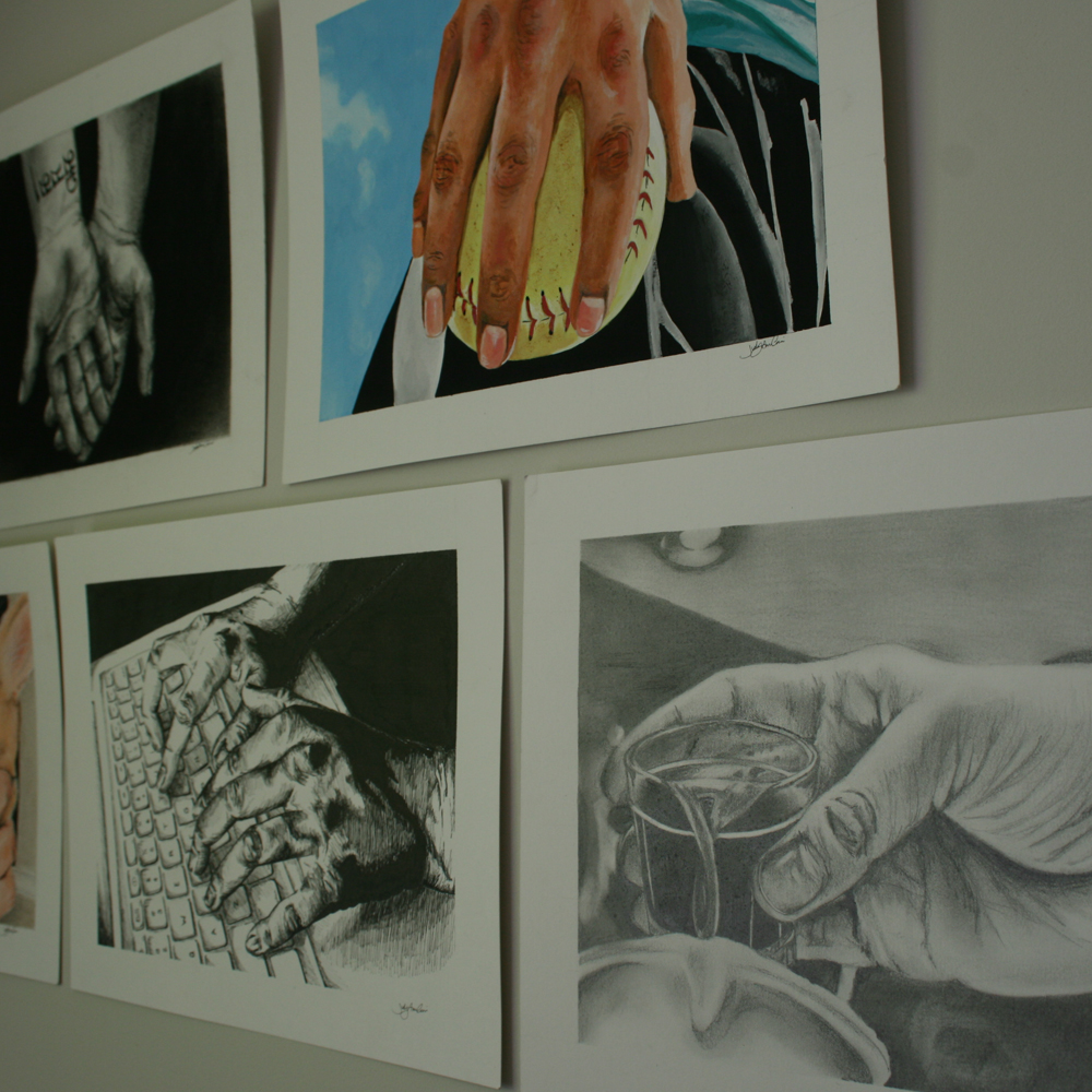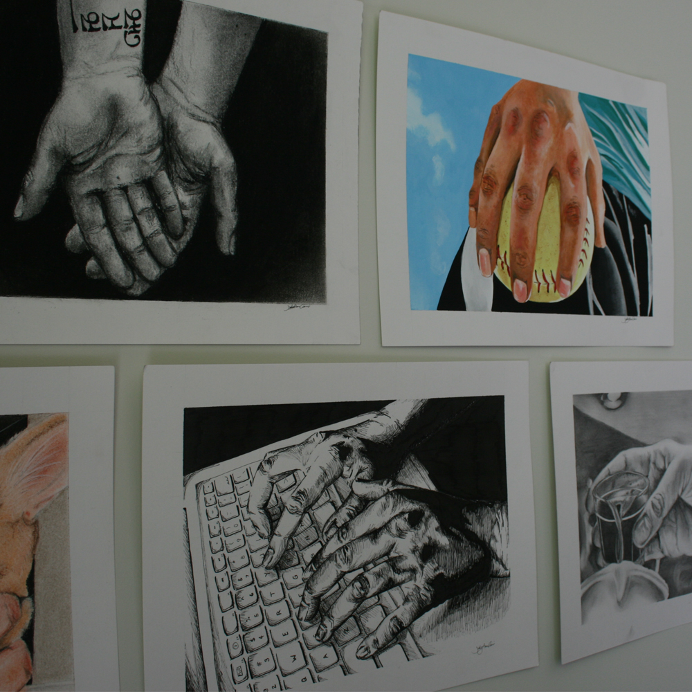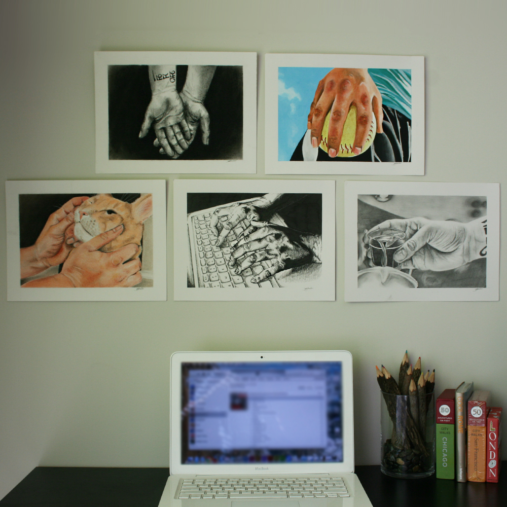 There are 2 projects displayed in this photoset, both representing a series. The first set of photos are 8 pairs of eyes. The subjects for the drawings include family members and friends. The eyes were drawn with colored pastels and measure 18×6 inches. The second set of photos is a small series that represented my life at the time, through my hands. This set was done in different mediums: ink, pencil, paint, charcoal, and color pastels and measure 10×7 inches.